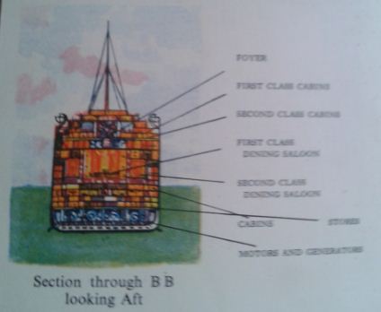 Built with a very definite stem, less pronounced stren post,strong external keel. On each quarter at the upper deck level, was a trough like projection, open at the after end which served to support the steering oars and into which these oars were drawn up and housed when not in use.